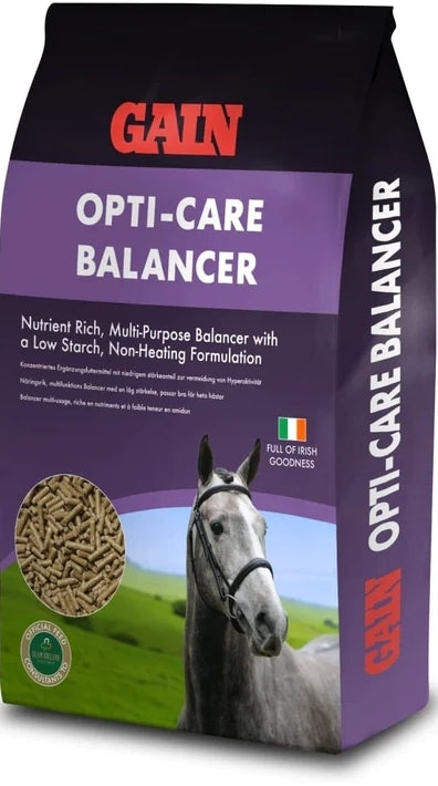 With a low calorie content, Gain Opti-Care Balancer is a useful addition to many feeding programs. A nutrient rich pellet, Opti-Care Balancer can be fed on its own to supplement a forage only diet, or can be used alongside hard feed when reduced feeding rates and so are not meeting the the horse's micro-nutrient requirements.