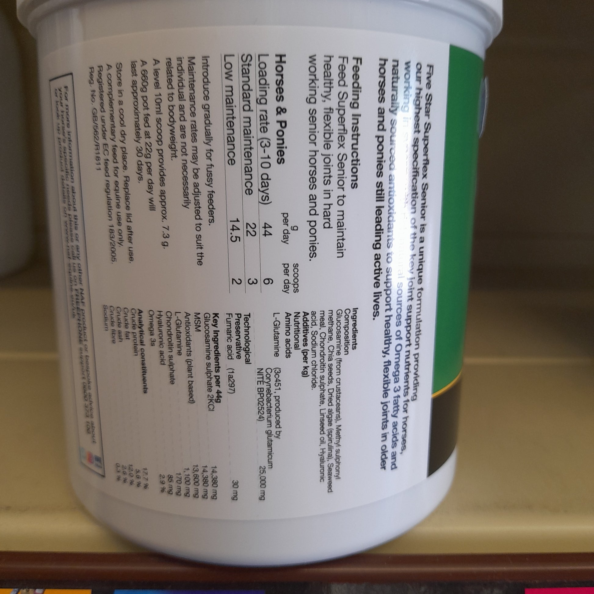 Five Star Superflex Senior is a unique formulation providing our highest specification of the key joint support nutrients for horses, working in synergy with rich natural sources of Omega 3 fatty acids and naturally sourced antioxidants to support healthy, flexible joints in older horses and ponies still leading active lives.