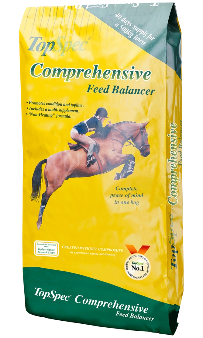 TopSpec Comprehensive Feed Balancer is a palatable, non-heating pellet which has been made without cereal grains for a low sugar & starch formula. Several supplements have been combined to provide a broad spectrum, high protein mix that includes digestive aids, hoof support & generous levels of antioxidants. The high specification probiotics in use help horses get more nutrients from other parts of their diet, helping reduce feed intake. Effective levels of protein, vitamins & minerals Fully comprehensive range of micronutrients Chelated minerals for improved digestibility Analytical Constituents: Oils & fats 5.5%, protein 25%, fibre 8.5%, ash 12.7% & sodium 0.4% Ingredients: Soya, wheatfeed, linseed expeller, high fibre oat b product, grass meal, vitamin premix, molasses, dicalcium phosphate, sodium chloride, yeast, magnesium oxide, MSM & Mannan Oligosaccharides